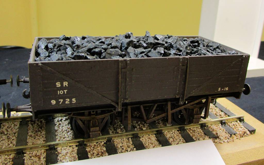 Here are more entries from James Aitken. These are SR 5 plank diagram 1380 Opens with 9' underframes. They are scratch built using home designed 3D parts (14 per wagon) - axle boxes, brake shoes, buffer housings and brake lever guides. The bodies are in 1.Smm plastic designed in CAD and cut on the club laser cutter. The strapping is in 0.Smm and the underframe in 0.8mm. The brake gear and W irons are in 1mm. Commercial wheels and buffer heads. Even the 3 link couplings have been hand made. Real coal on extruded polystyrene bases was used to create the loads which can be removed.
