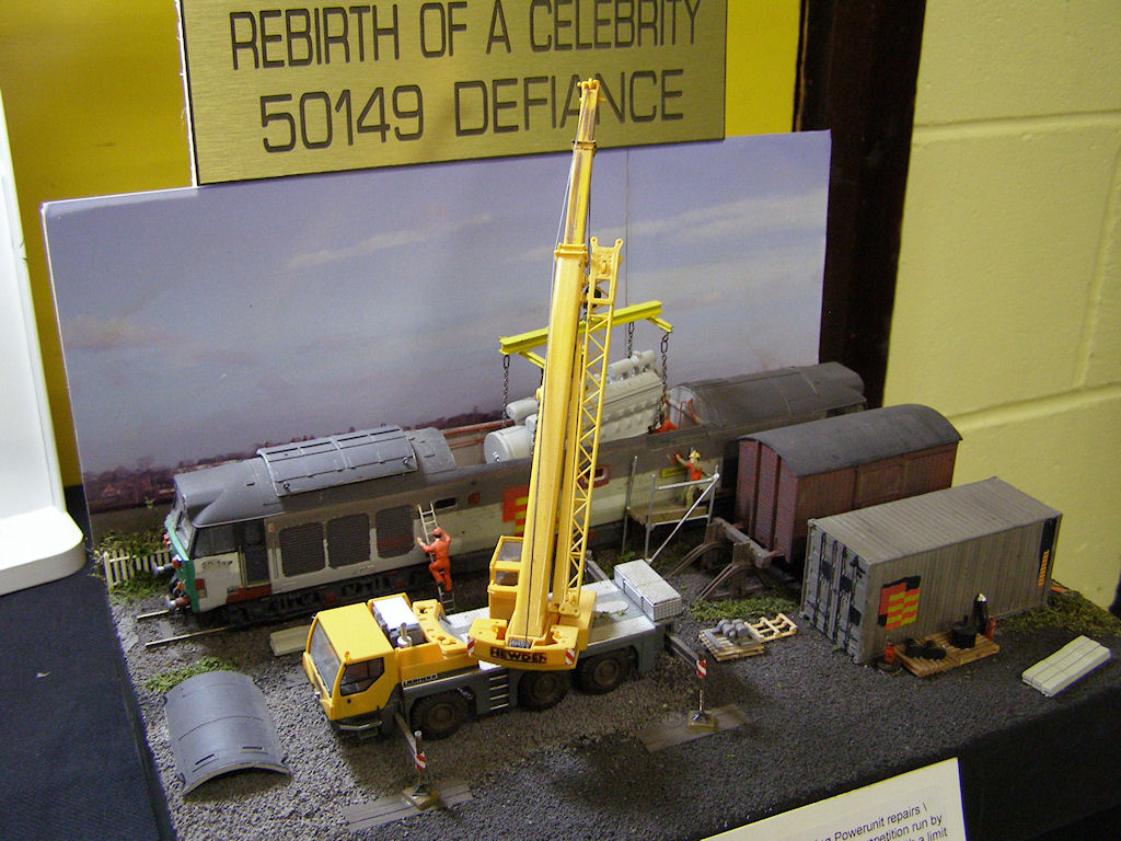 Description: This model was built for a competition run by Rail Express magazine Dec 2004 to Jan 2005 with a limit of 100 sq inches. The Class 50 was a Lima product and now features a detailed interior with the power unit and crane by Herpa, 4mm/ft, OO gauge.