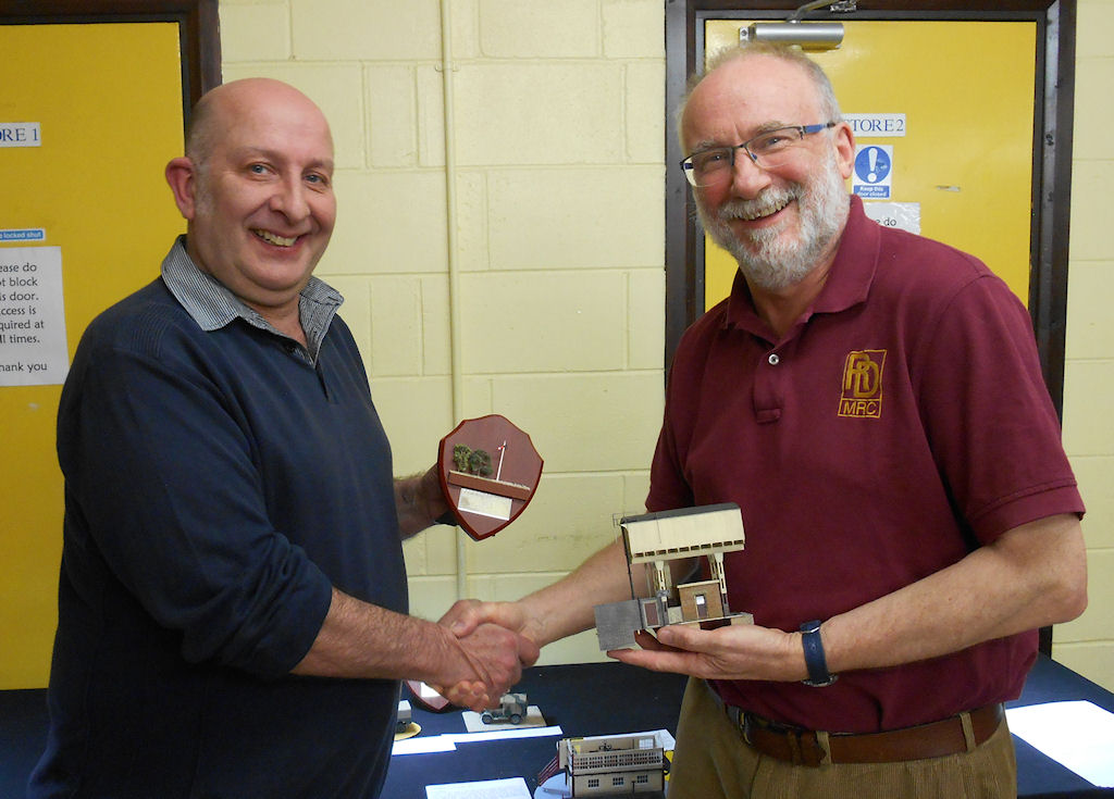 Description: The standard GW water tank. Except the tanks aren't standard when you start looking at them, with all sorts of permutations of pipe work and panels. The hut was a wartime addition for inspecting staff at the station. The tank is made from etched brass sheets on a plastic card box, with Evergreen supporting beams. Flanges and plates are hand riveted. The walls and hut were produced on the Club's laser. The water indicator plumb bob is very fine twisted lead wire (0.2mm) and is blighter to keep straight!! The cross bracing is wire with fine bits of Evergreen square section drilled through. The ladder is missing as it can only be added when the model is planted as it foots onto the platform ramp.