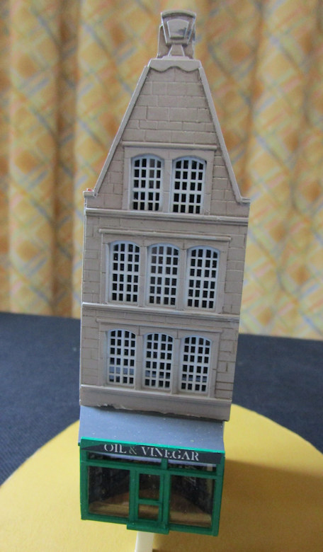 Description: Scratchbuilt model using the Club's laser. Rooftiles by Reductex. The shop front is a 3D print that has been reduced in width to fit the model. The interior is from photos, venetian blinds are etched brass. This is the center of the row of canal side buildings I am constructing based on those in Utrecht.