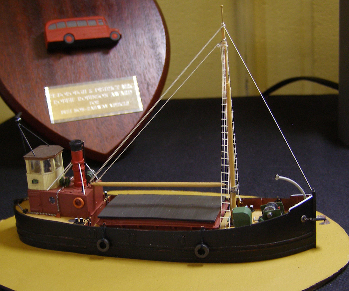 Description: 1:152 Clyde Puffer. the main structure is a resin casting from GRA Models. All the details have to be scratchbuilt including: mast & boom, anchor, radar, rigging & ropwwork, hold planking, etc. The winch is a greatly modified resin casting from the kit with brass paipework and cotton rope.