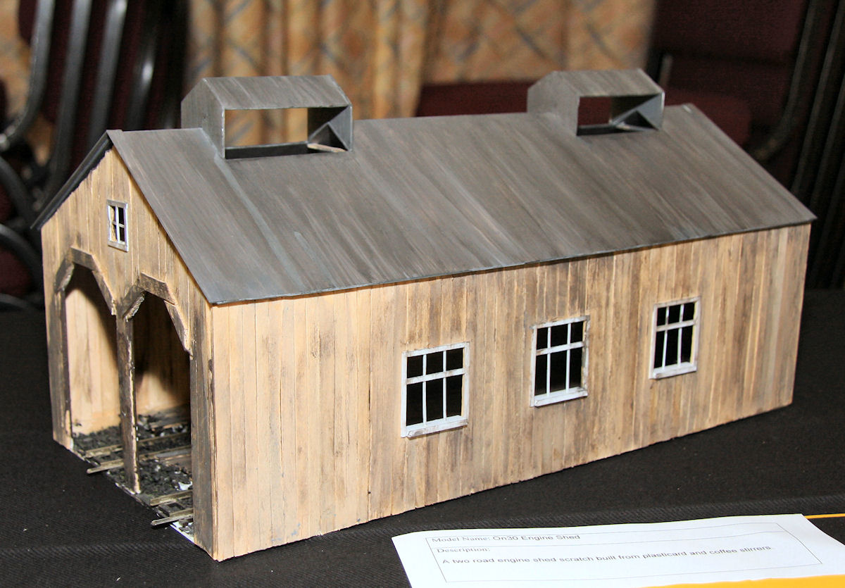 Description: A two road engine shed scratch built from plasticard and coffee stirrers.