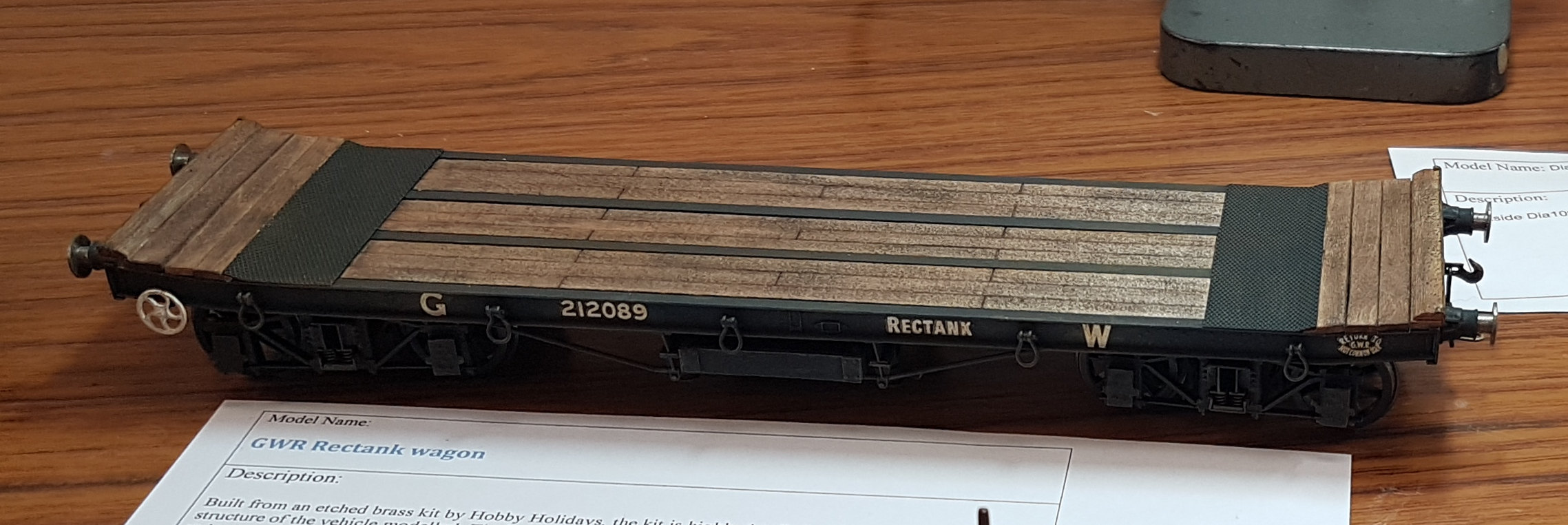 The model has been built from an etched brass kit by Hobby Holidays. The kit is highly detailed with the complete beam structure of the vehicle modelled. The bogies are made from brass castings separated by thin etched strips to make the diamond frames. The bogie springing works properly. The wooden parts are real wood. This model also was also a winner of the Freight and Engineers Stock category where it shared the honours with James’ SR Bogie Bolster wagon.