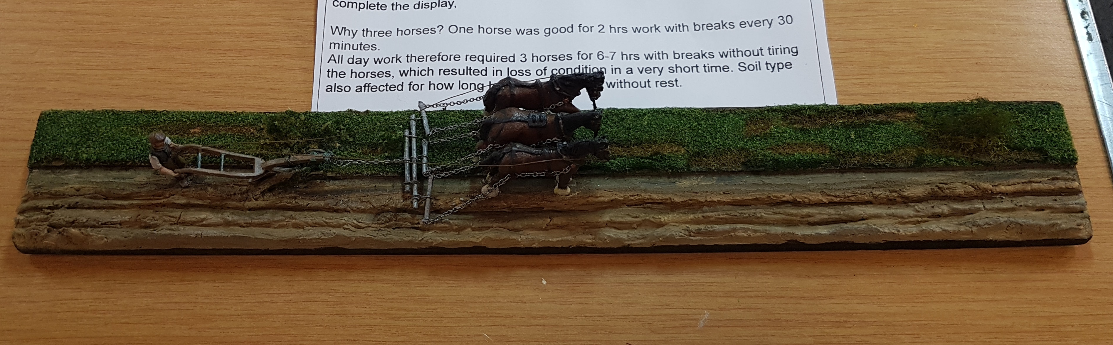 The winner of the Dioramas and Figurines category was John Ashby with his model of a three-horse plough team. The reason a plough needed multiple horses was because a single horse would tire quickly ploughing a single furrow. Put three horses on the job and a farmer could plough for 6 – 7 hours per day with breaks.