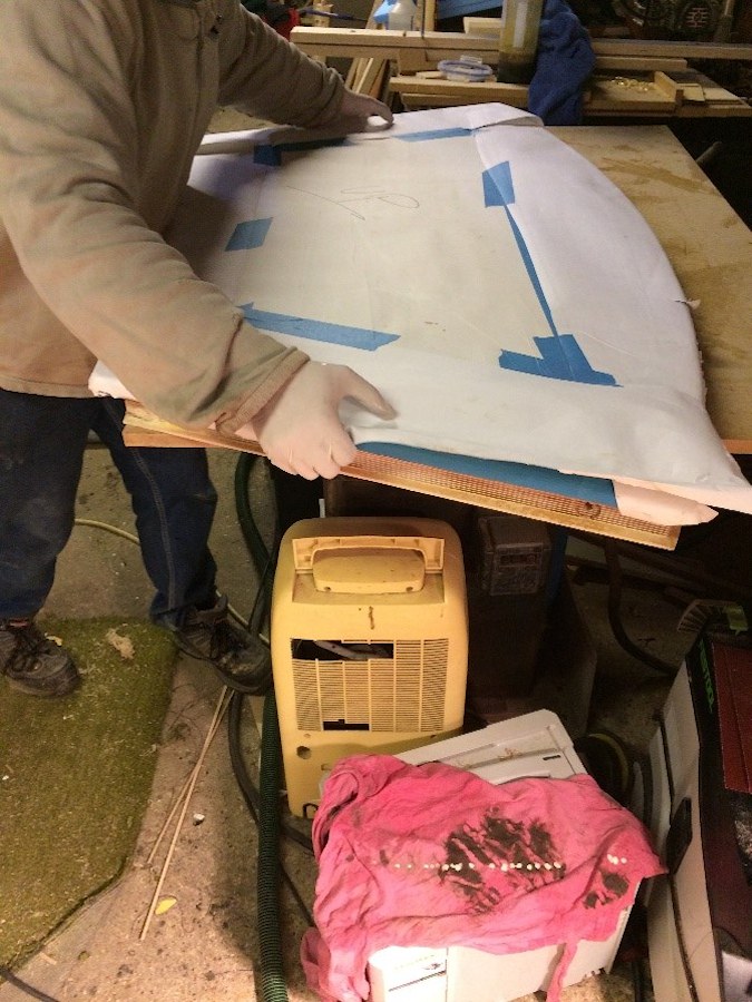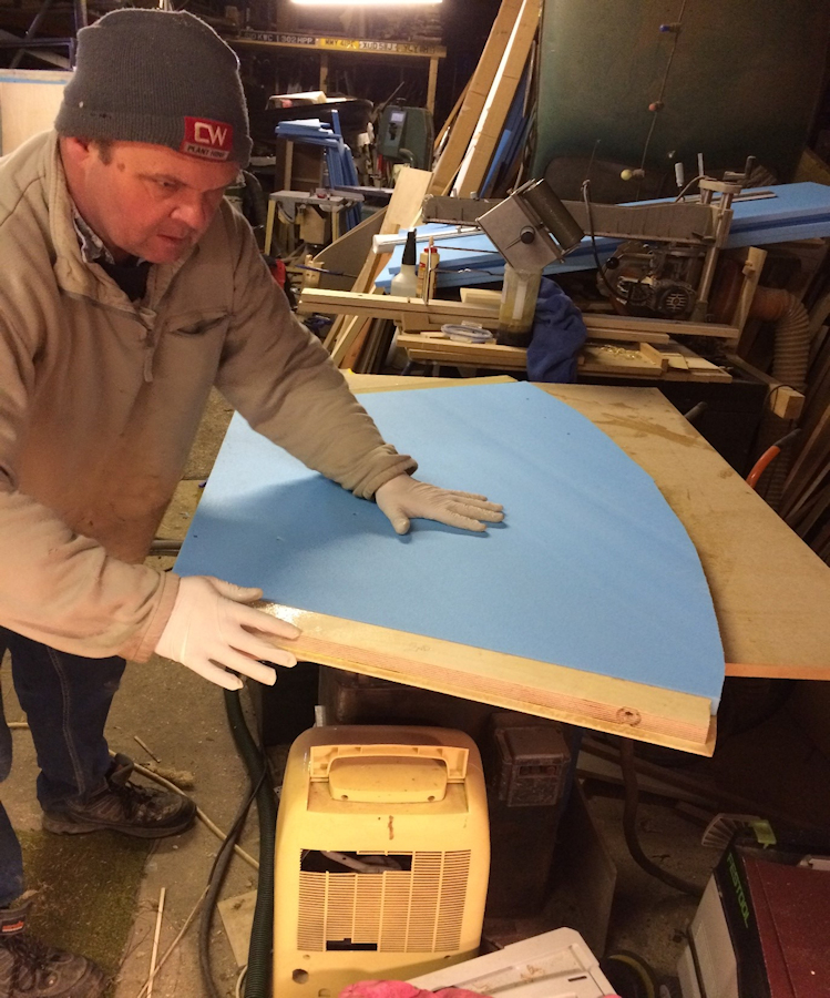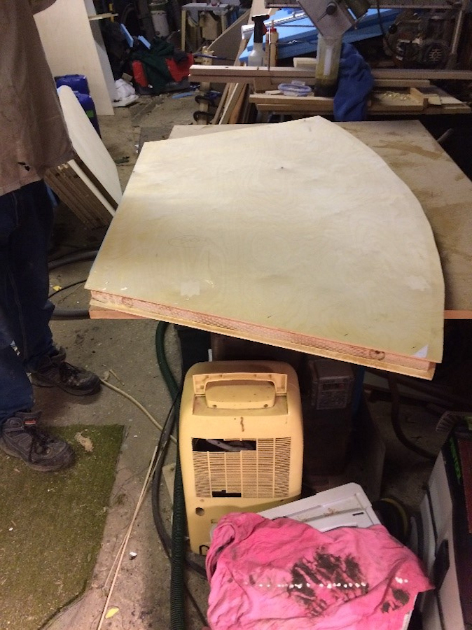 For the curved boards a jig was made into which we could locate the board ends to enable us to have a consistent angle on the board. The next step is to glue, clamp and staple a 3mm board to the end pieces. Once this is set 1-2 hrs we can move towards completing the lamination of the board. Jon is getting ready to glue the top ply to complete the laminated board.