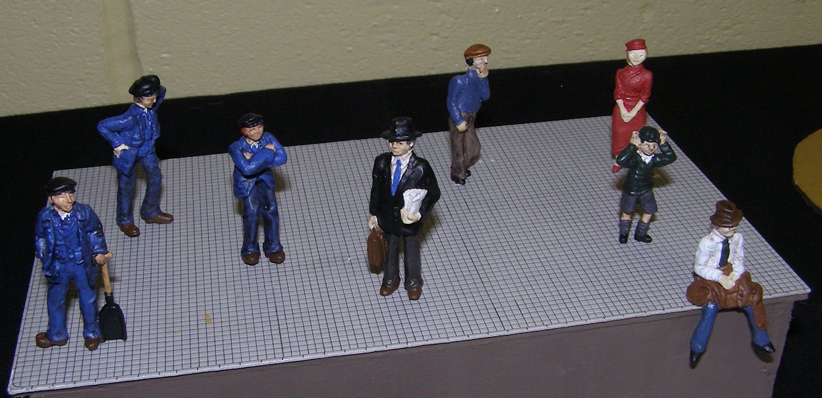 Description: Passengers and railway workers for Okehampton. 1:43 white meral figures from Aidan Campbell painted in acrylics.