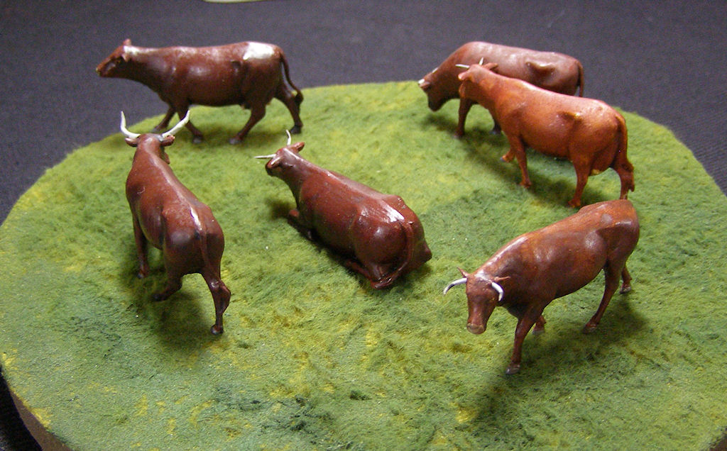 Description: The Devon Red is a breed local to the Okehampton area of Devon and can still be seen there. These are 1/48 scale (prefect for younger animals in 1/43) plastic animals which have had horns added from track pins (this breed of cattle has cows and bulls with horns), painted in acrylics to show the variation in the red colour of the breed. These cattle will be livnig on our model of Okehampton station, possibly in the cattle dock!