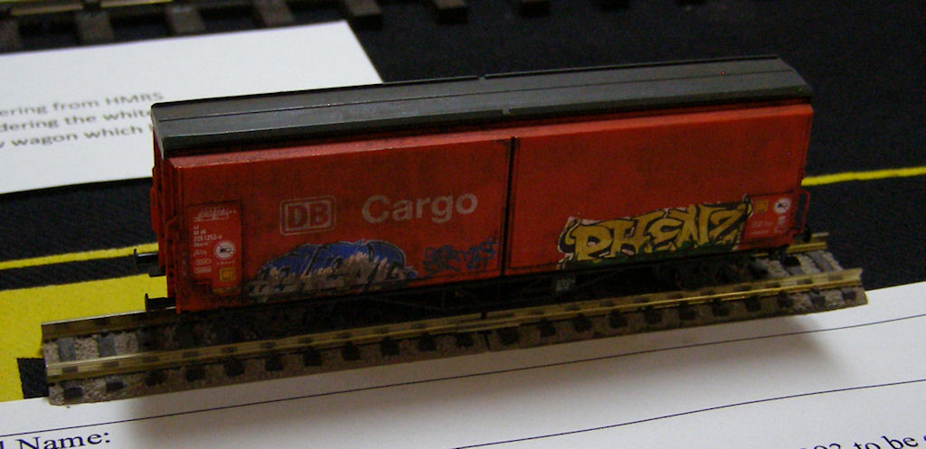 Description: A Fleischmann model of a moder DB box van (and HBIS tt293 to be exact) with added graffiti and dirt.
