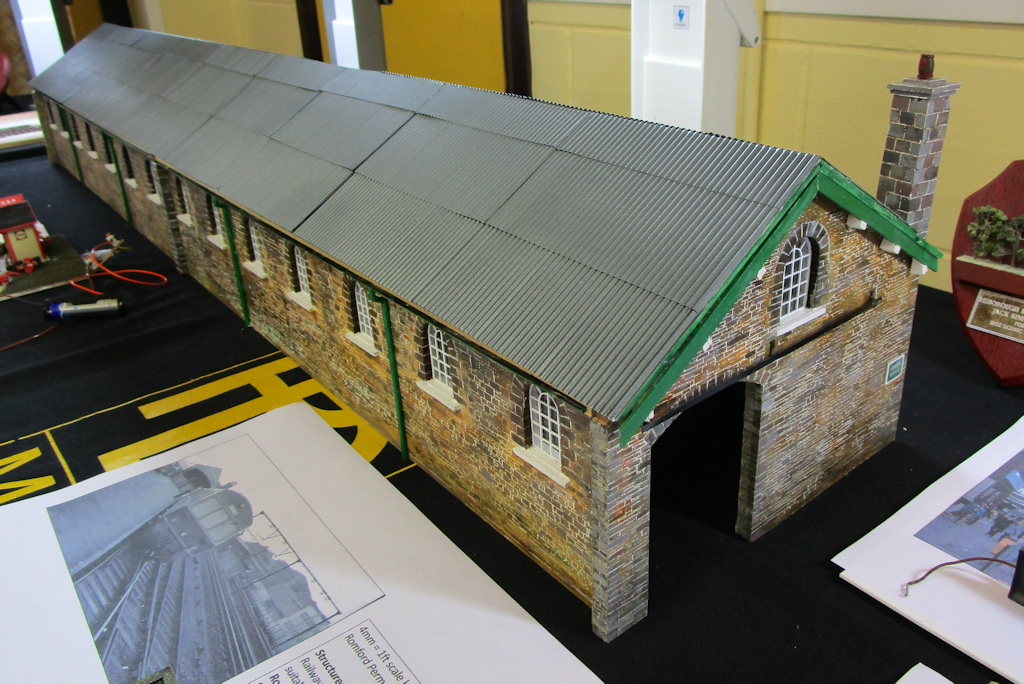 Description: The model is scratch built (although window frames were laser cut externally before the club purchased it's own), and Ambis 'corrugated iron panels' were purchased for the roof. The main structure consists of MDF panels which were laser etched from heavily edited (or Photoshopped!) modern photographs of the building (now a Youth Hostel). This replicated the random stone work of the original building, which were then painted by an artistic family member, with the ability to represent the variety of colours in the original stones. A late change of specification mandated that the roof be made removable so that wagons could be retrieved from the track inside in the event of a derailment. The structure is presently in units for ease of development, but will be permanently embedded in the layout in due course. The road side of the building has not been completely developed as it is close to the rear of the layout and not visible to the viewer.