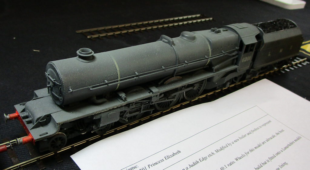 Description: Built to P4 standards based on a Judith Edge etch. Modified by a new boiler and firebox to represent the loco in 1947 just post war. The loco chassis uses a Mashima 1220 motor with a 40:1 ratio gearbox. Wheels for this model are Ultrascale, the best Masokits sprung bogie, all driving wheels are sprung. The tender is a Comet body, simple, quick and accurate to build but is fitted on to a Lanarkshire Models chassis which provides more detail and is sprung. It is depicted in the then LMS black colour scheme with red and straw lining.