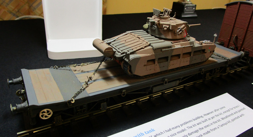Description: The rectank is a kit from JLTRT which I had many problems building. However after some perseverance it has turned out to be a nice model. The kit was built as per the kit, except for brass I beams under the floor as I managed to severely damage the ones in the kit. Weathered and painted using Precision paints. The tank is a British Matilda tank made from a Tamiya kit, painted with Tamiya acrylics using an aribrush. It is 1/48th scale.