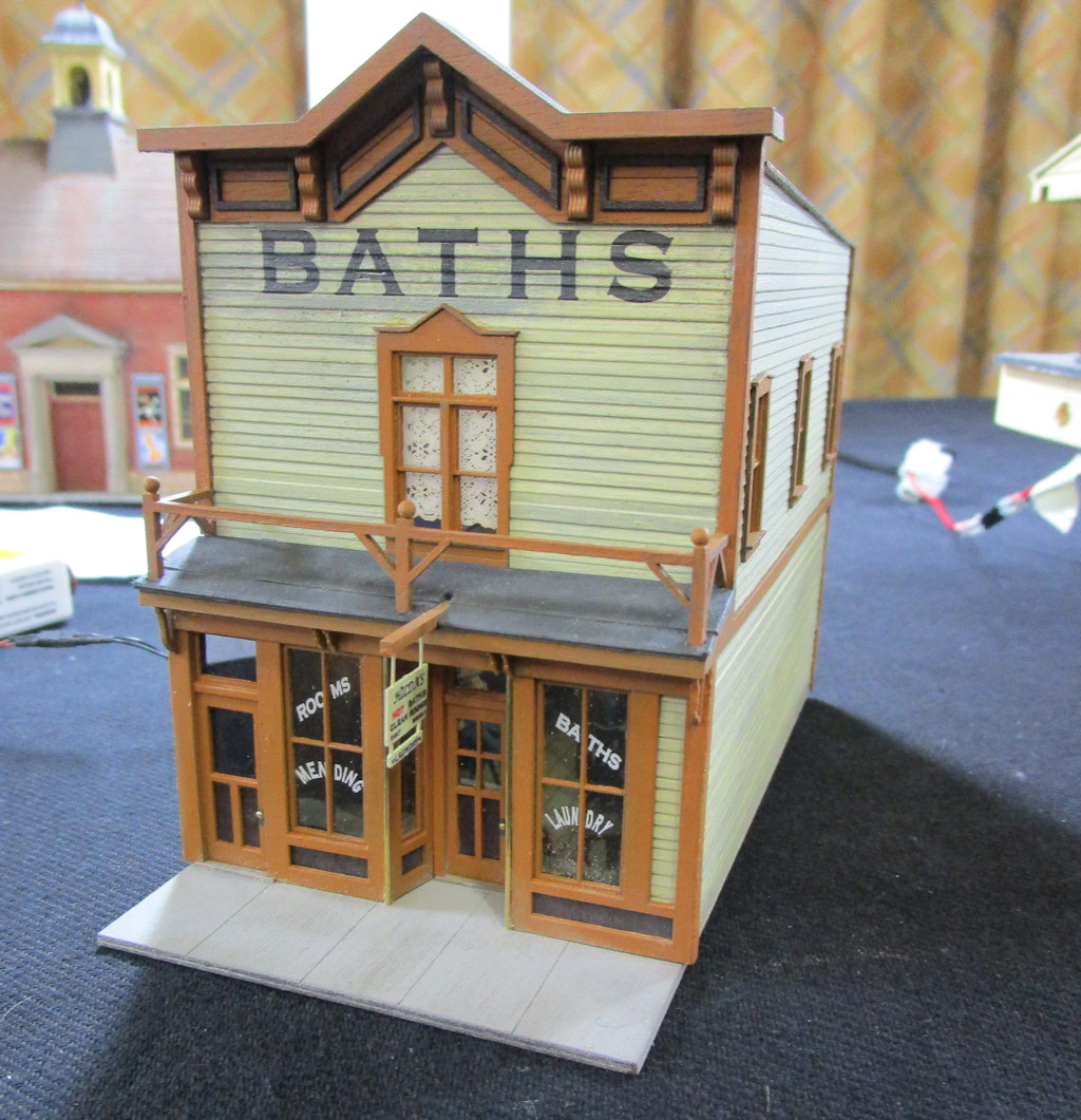 Description: Model of the “Baths” building in Telluride, Colorado, as it was around 1951, and used as a café as well as a Laundry, rooms and bath house. Model is built from a Raggs To Riches laser cut wood kit, and has been equipped with a lighting system and a complete interior in the café area. Upstairs lights are set to go on and off at random.