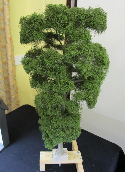 Description: an elm tree constructed for Okehampton. This has a 6mm stainless steel threaded rod as the main support with branches made from florist's wire. This is covered with wood filler to bulk out the trunk and then an acrylic paste to form the bark. Painted with acrylic paint and washes with foliage from ???.