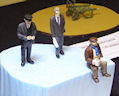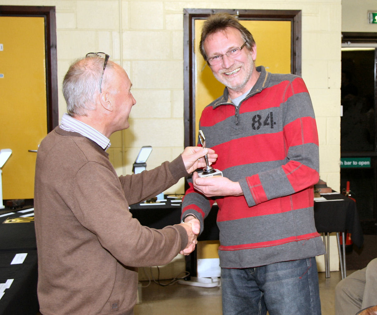 Phil Baxendale (right) receiving the Wheeltapper Trophy from Barry Norman.
