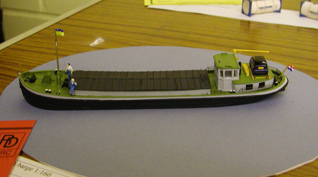 Paul Wright's Dutch Barge in 1:160 scale. The barge made from resin and etched brass Artitec kit. The smartcar is made by Busch, the figures by Preiser (painted by myself) and the crane is scratch built. The flags are produced on a laser printed and the Civil jack on the stern and the flag of Flavoland on the mast. The mast stays are made from 0.05mm wire.