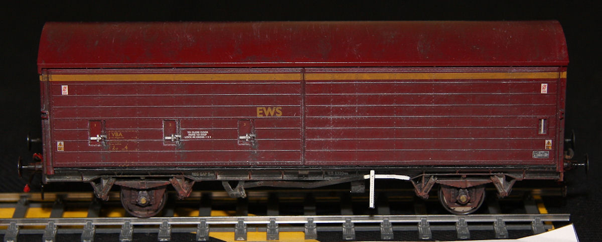 Description: A Bachmann 35 ton sliding door box van in EWS. It has been converted to P$ gauge using Bill Bedford and Colin Craig finescale disc break wheels 12 mm dia, it has alos been fitted with Masokits etched screw couplings.