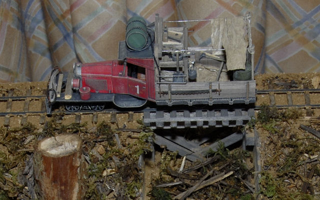 The rail-truck started life as a Bachmann R-T-R model. The rear of the vehicle was stripped and the electronics board and wiring removed so that the new DZ143 chip could be installed in a smaller space under the workshop racking. The truck has working head and tail lights. The workshop is scratch built plywood and bass wood that has been pre stained, built to look crooked and weathered. Detail parts are a combination of scratch built castings from Grant Line and S&D Models, painted and weathered prior to installation. The canvas is standard printer paper that has been crumpled and rolled in the hand to destroy the finish and make it supple which then accepts a wash of paint. The cab and chassis have been re-sprayed and give a liberal grimy wash before dry-brushing.