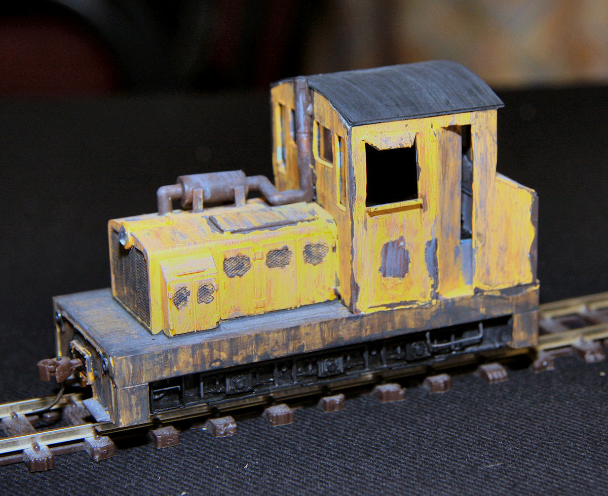 Description: A conversion from a HO Plymouth Diesel with new cab and silencer made from plasticard. This model has been repainted and weathered by hand usning acrylic paints.