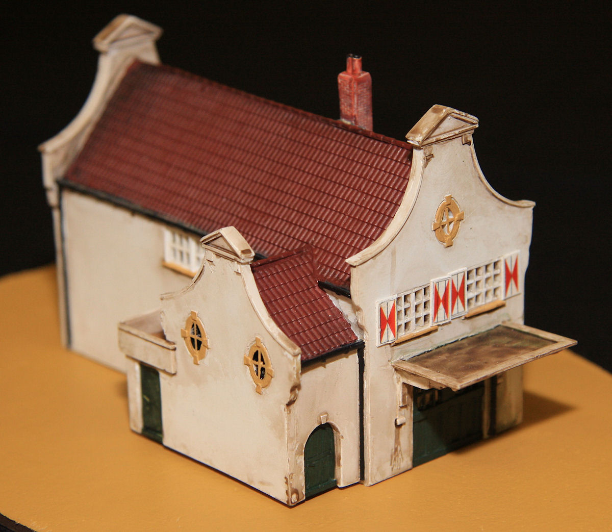 Description: This is a resin kit by Tilly Models and is a copy of an existing building in Nijmegan. The shutters are plastic strip and home made decals. The prototype is now part of a bank. Painted in acrylics.