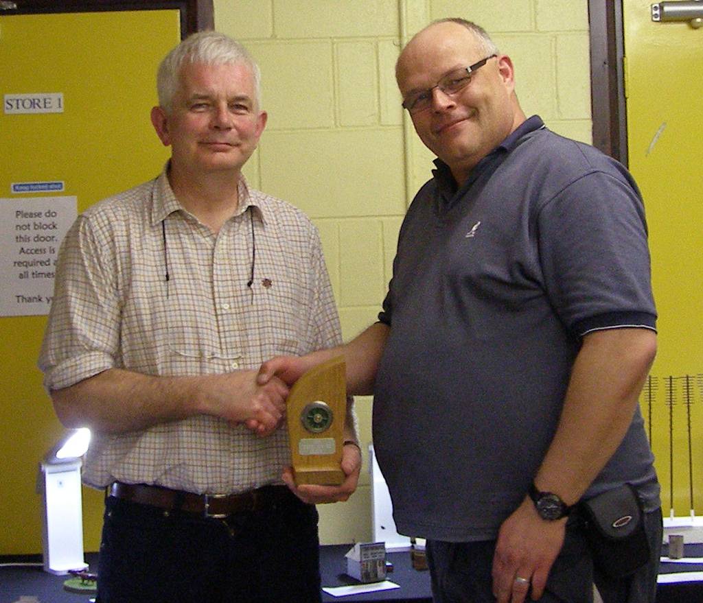 Michael Lane(right) receiving the Chairman’s Cup from Paul Wright for his model of a set of telegraph poles for the club’s Okehampton layout.
