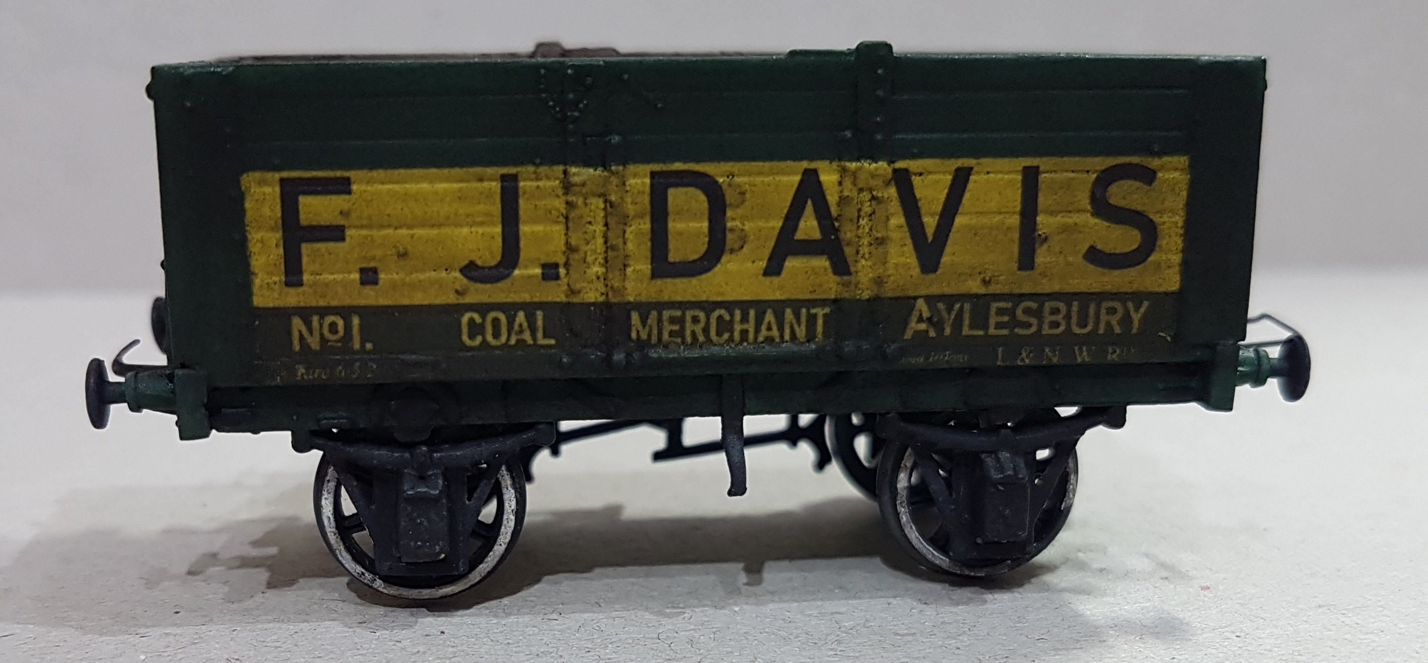 The winner of the category for best model for the club’s EM gauge model of Aylesbury LNWR was Paul Wright for his F. J. Davis Private Owner wagon. The model is a Cambrian 6.5 plank plastic wagon kit. The decals are home-made, with the yellow lettering being clear over a yellow base coat as yellow letters over green do not show up. It is the real livery of the coal wagons owned by F. J. Davis in the Aylesbury area.