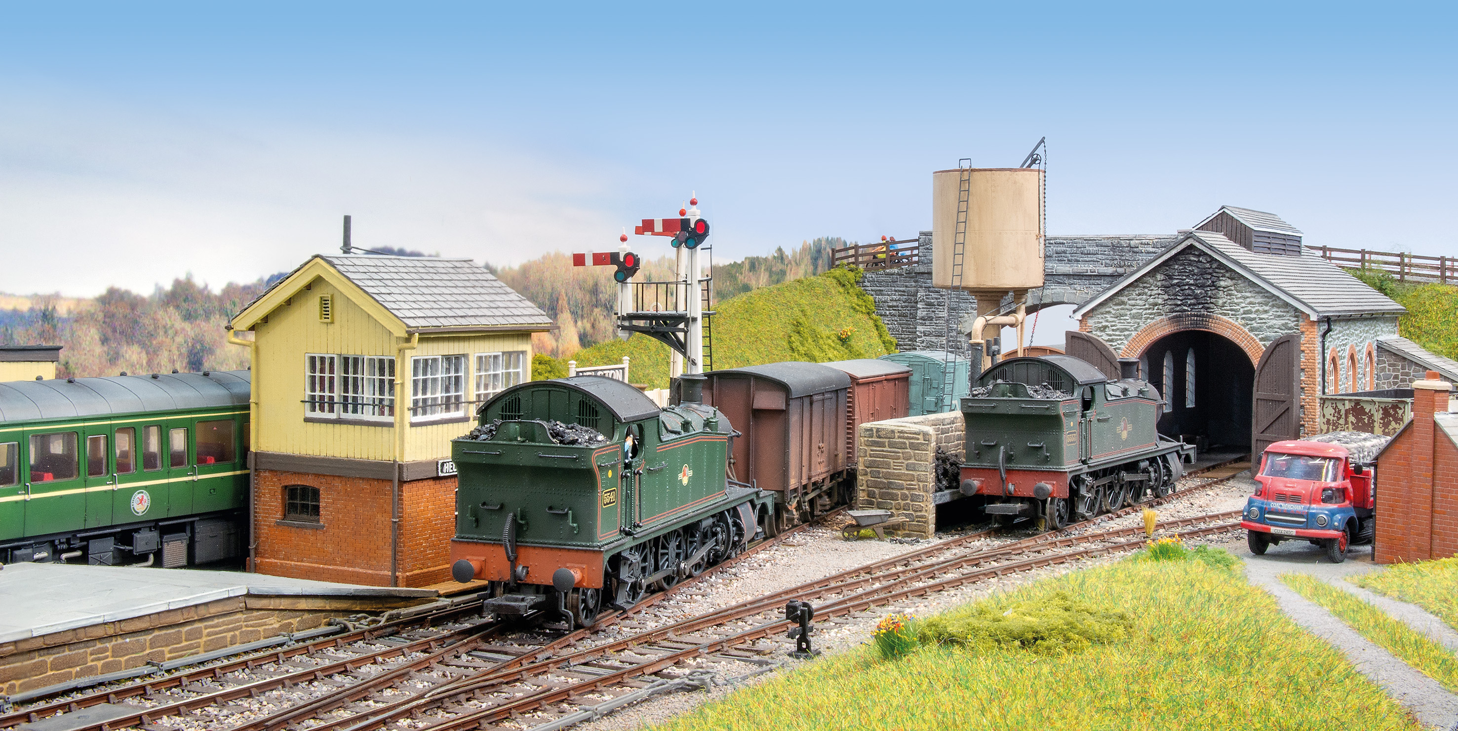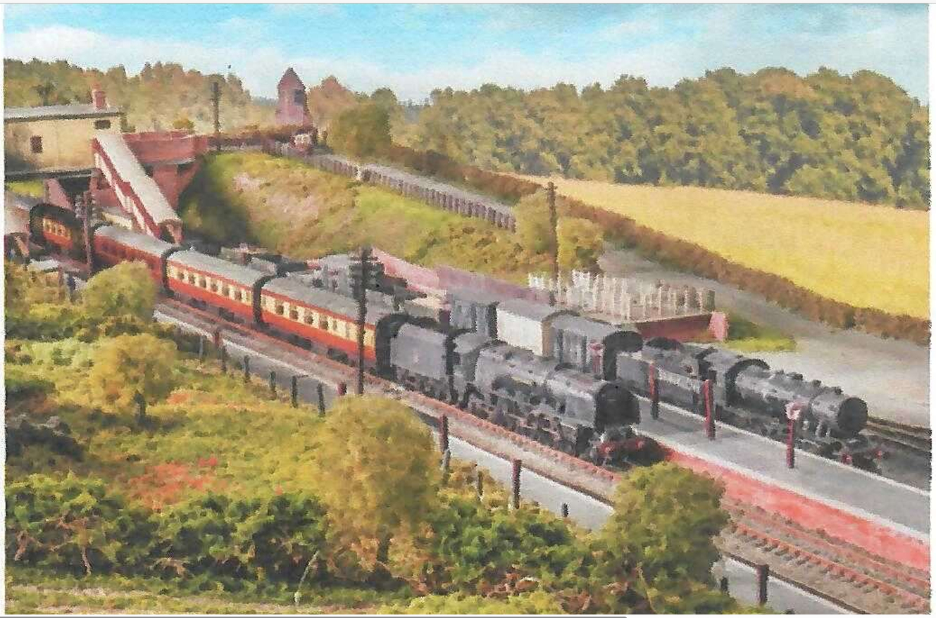 Brinklow by Wayne Webb & Mike Biss. This layout is based on Brinklow station which was part of the Trent Valley line between Rugby and Stafford, and the layout features a scale half mile of the line. It is set in the BR days between 19050 & 1965. The Brinklow section only ever has three lines, with no down slow, due to the proximity of the Oxford canal, which is incorporated into the layout.