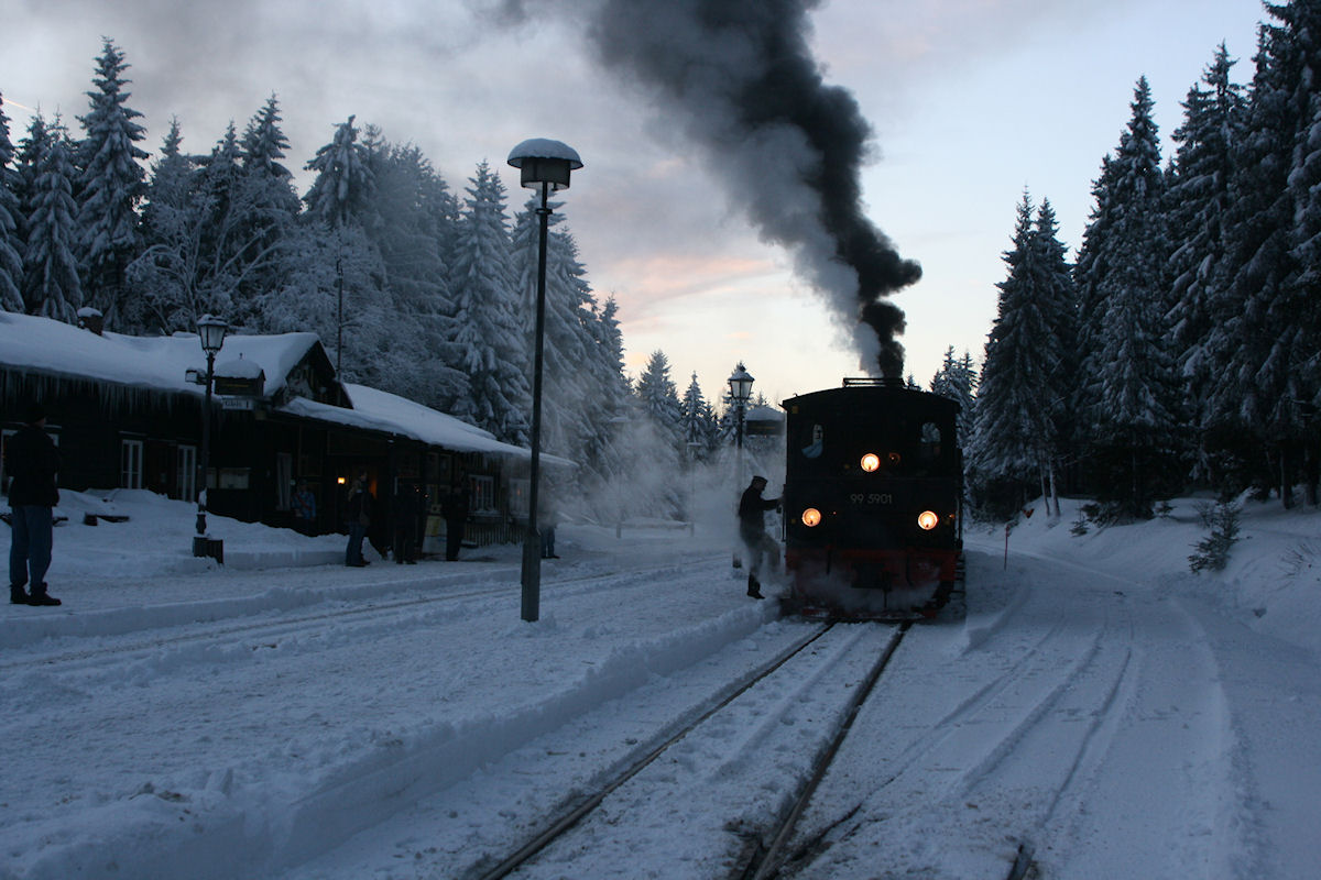 "Last winter's early December snowfalls even caught-out the normally efficient Germans, and the metre-gauge line from Drie Annen Hohne (junction with the Harz Railway 'mainline' from Wernigerode to Nordhausen) to the 3,700 foot summit of the Brocken mountain had only re-opened that afternoon, Monday 6th December 2010. The photo was taken at the passing-loop station at Schierke on the return journey just as the winter sun was setting. The locomotive is an 0-4-4-0T Mallet, number 99 5901, which is always popular with visiting railtour groups."